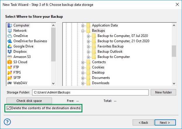 A new feature has been added to the Computer plugin due to our users′ numerous requests. Now, when creating a backup task, you can clear the destination folder in which the backups will be stored.